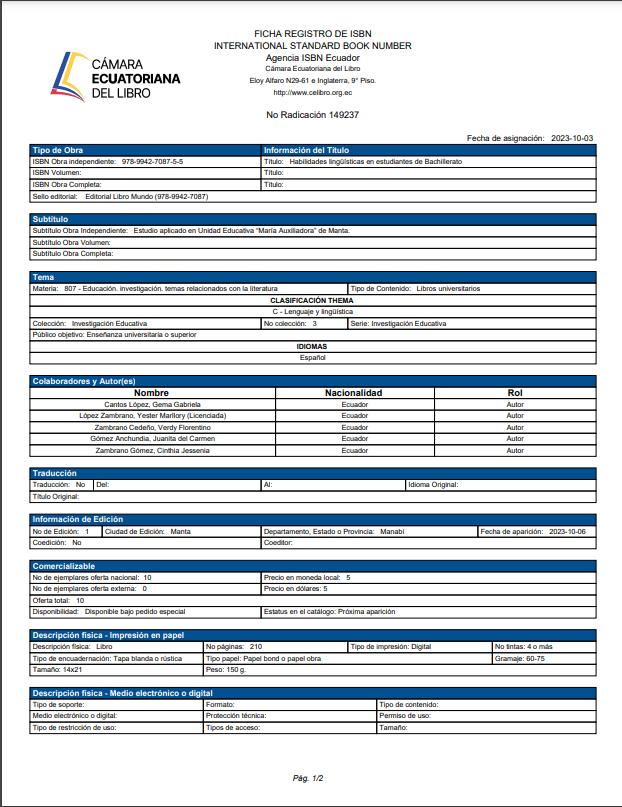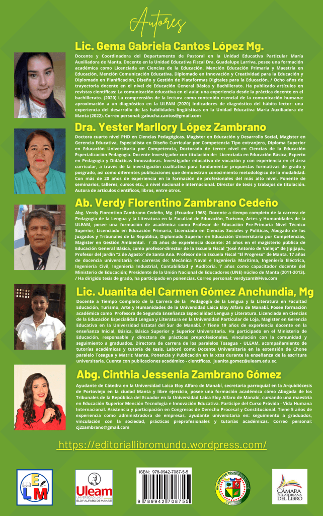El presente libro toma como referente un estudio investigativo que aborda reflexiones sobre el desarrollo de las habilidades lingüísticas y la capacidad de comunicación en los estudiantes del Bachillerato de la Unidad Educativa “María Auxiliadora”, de Manta (UEMAM).