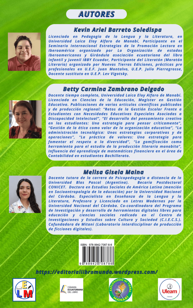 Este libro es el resultado de una investigación innovadora y contextualizada sobre la gamificación y la literatura Manabí. Es una obra necesaria porque recupera la historia cultural de un pueblo, la resignifica y la circula. A través de sus páginas, podemos conocer y valorizar la literatura Manabita: sus temas y autores. Para lograr eso, los autores retoman la gamificación como estrategia de aprendizaje significativo.