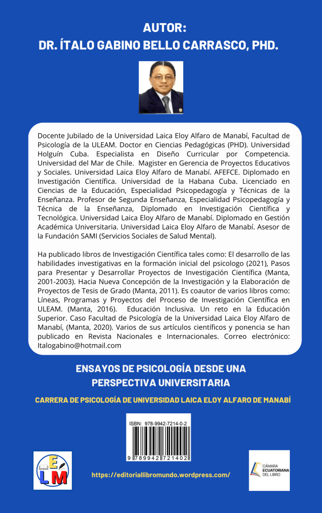 Ensayos de Psicología desde una perspectiva universitaria, es una invitación debidamente sustentada para fortalecer el quehacer psicológico, educativo en un medio universitario. Este libro se convierte en un valioso y útil aporte que nos orienta apropiadamente en un camino sobre todo educativo.